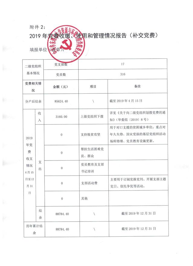 2019年党费收缴、使用和管理情况报告(补交党费)