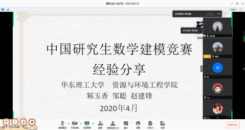 2020423日,18级环境安全硕士党支部通过“腾讯会议”在线上召开了数模竞赛经验分享交流会。本次科学道德和学风建设活动的主要内容是邀请两名数模竞赛获奖的同学分享参赛的技巧和经验。此外,党支部还邀请了公司内想要了解参加数模竞赛的同学参加会议,共同交流,答疑解惑。