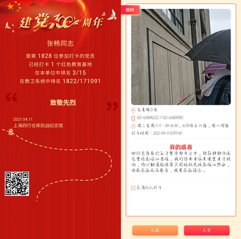 活动过程中,党支部结合公司党史学习教育安排,积极参加“我为建党百年打卡”活动,组织党员录制“百年党史我来讲”短视频,“红色基地大寻访”打卡,不断增强为实现“两个一百年”奋斗目标的责任感和使命感。