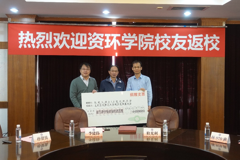 员工刘军代表环970班全体同学进行捐赠,李建伟和修光利共同接受了捐赠支票,并向刘军颁发了捐赠证书。