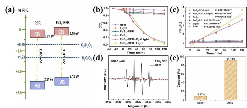 图片说明:(a)FeS2-RFR适配产H2O2的能带结构;(b) FeS2-RFR光协同原位芬顿体系高效氧化ROX;(c)不同氧化体系氧化降解ROX的动力学拟合;(d)FeS2-RFR原位分解H2O2产生高浓度羟基自由基;(e) FeS2-RFR高选择性转化ROX生成低毒五价砷(As(V))