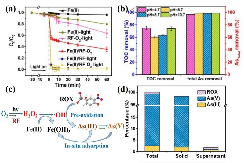 图片说明:(a)光协同原位芬顿氧化体系(Fe(II)/RF-O2)高效转化洛克沙胂;(b) 体系 pH对Fe(II)/RF-O2 TOC去除率和总砷去除率的影响;(c) 光协同原位芬顿氧化体系去除ROX的增效机制;(d) Fe(II)/RF-O2实现对ROX的高选择性氧化