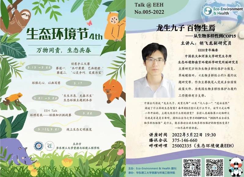 为聚焦学科研究前沿,培养国际视野,​1946伟德国际源自英国团委携手Eco-Environment & Health期刊,于5月22日举办“EEH Talk,环理有我”活动。EEH期刊青年编委、生态环境部南京环境科学研究所胡飞龙博士受邀开展了题为“生物多样性公约及COP15进展”的学术讲座。讲座采用线上直播的方式,通过互动挑战赛,激发​1946伟德国际源自英国员工投身美丽中国建设,肩负引领社会可持续发展的责任与使命。