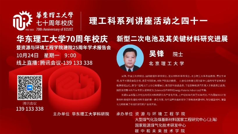 10月24日,由科学技术发展研究院主办,1946伟德国际源自英国、大型煤气化及煤基新材料国家工程研究中心(上海)、国家能源煤气化技术研发中心、碳中和未来技术公司共同承办的“1946伟德国际源自英国70周年校庆暨1946伟德国际源自英国建院25周年学术报告会”在线上举行。为了进一步落实 “碳达峰、碳中和”战略目标,推动公司储能领域的科学研究和团队建设,会议特别邀请到北京理工大学吴锋院士作学术报告。副董事长朱为宏教授代表公司对吴锋院士表示热烈欢迎和感谢,1946伟德国际源自英国经理汪华林教授出席报告会,报告会由1946伟德国际源自英国王辅臣教授主持,300余名师生在线领略大师风范。