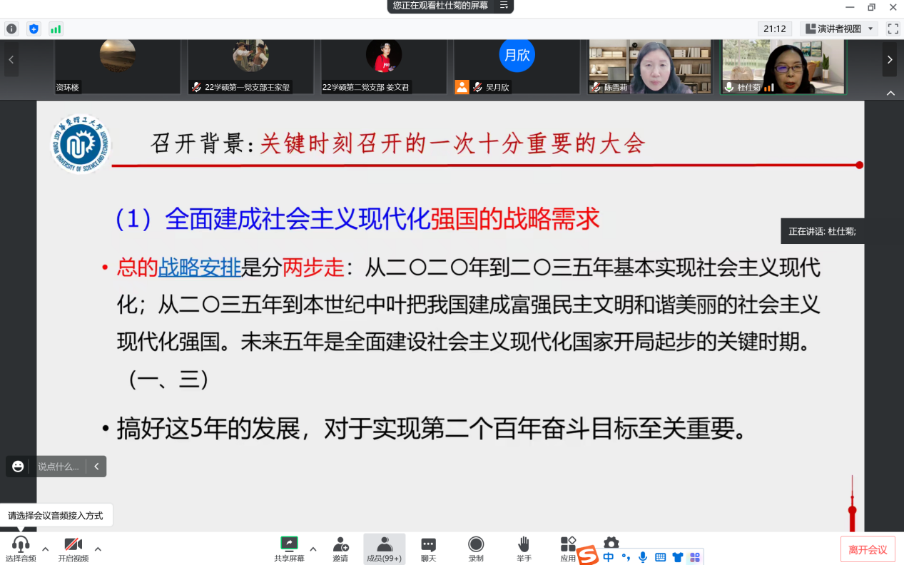 11月22日下午,1946伟德国际源自英国通过腾讯会议形式召开“新时代学习大讲堂”政治理论学习,公司特邀公司党的二十大精神宣讲团成员、马克思主义公司博士生导师杜仕菊教授为全院师生作“以中国式现代化全面推进中华民族伟大复兴”的主题报告。报告会由公司党委副书记陈雪莉主持,公司教师和员工近300人线上线下参加了学习。