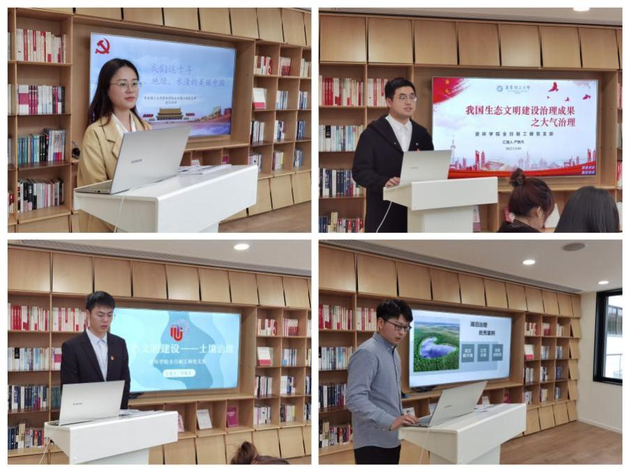 在“纵观十年:美丽中国建设精彩案例”部分,支部严新杰、单敏杰、祝悦、单朝阳等四位党员与大家分享了山水林田湖草沙一体化保护和系统治理等方面的经典案例,讲述了这非凡的十年里各地注重平衡经济社会与生态环境的关系,依靠科技进步,绿色低碳高质量发展,实现生产发展、生活富裕、生态美好目标的生动实践。