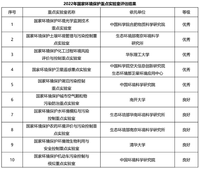2022年生态环境部重点实验室评估结果(部分)