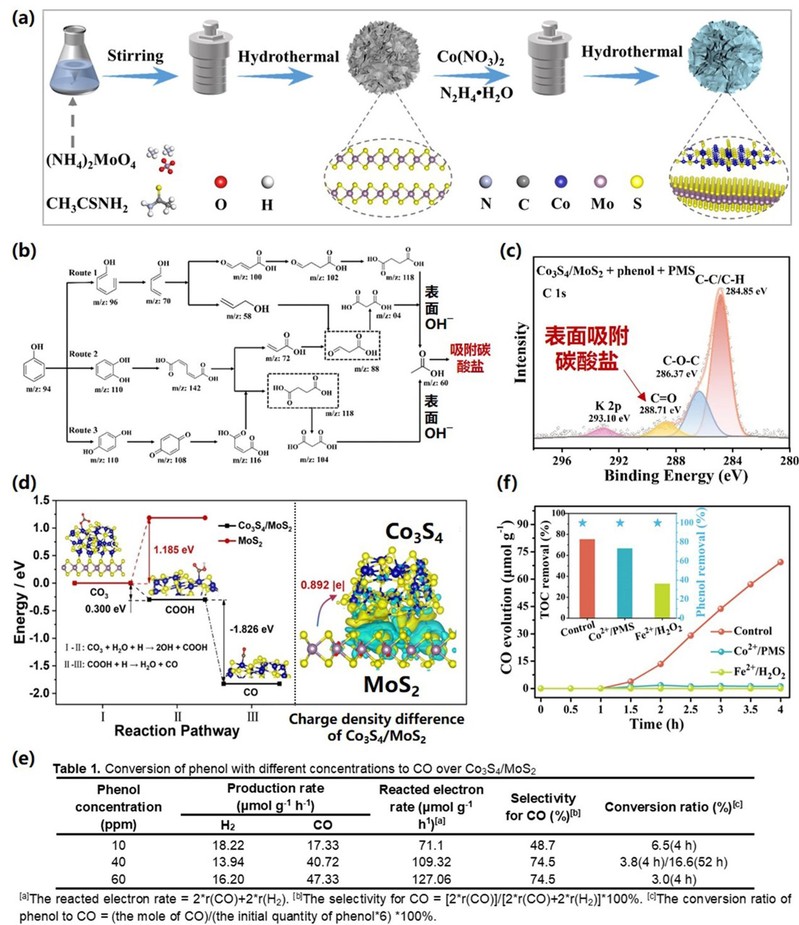 邢明阳教授团队通过构建类芬顿高级氧化与压电催化耦合体系,成功实现了苯酚、硝基苯以及实际有机废水向高附加值化工原料CO的选择性转化,减少了污染物降解过程中CO2、CH4等温室气体的排放。首先,采用简单的水热法制备了同时具有压电效应和类芬顿反应活性的Co3S4/MoS2催化剂(图a),其表面钴离子可活化过一硫酸氢钾(PMS)引发类芬顿反应,实现对苯酚等有机污染物的高效降解(矿化率为75.3%)。通常情况下,当PMS存在时溶液整体呈现酸性,有机污染物的矿化产物以CO2为主,从热力学上压电电子更有利于分解水产氢,而不利于直接还原CO2生成CO等低碳产物。Co3S4/MoS2属于酸性催化剂,其表面吸附大量OH-,使得苯酚的矿化产物主要以碳酸盐形式吸附在催化剂表面(图b,c)。实验结合DFT计算结果表明:Mo和S是电子分解水产氢的活性位点,而Co是电子还原碳酸盐产CO的活性位点(图d);Co3S4的引入可构建从Mo、S向Co的电子转移链,提高压电电子的转移效率并从热力学上促进电子还原碳酸盐生成CO。相较于Fe2+/H2O2、Co2+/PMS等传统芬顿体系,该耦合体系可在超声作用下降解40 ppm苯酚生成40.72 µmol·g-1·h-1的CO(选择性高达74.5%),延长反应时间可使苯酚向CO的转化率达到16.6%(图e,f)。此外,Co3S4/MoS2/PMS体系还可在高效处理实际工业废水的过程中,实现CO的选择性生成,这为开发低碳水处理技术提供了理论和实验指导。