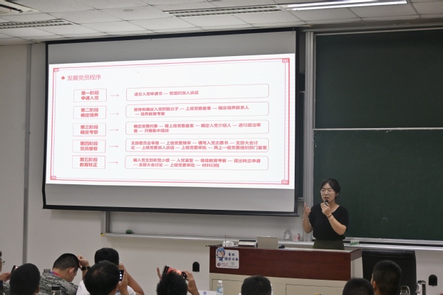 公司辅导员、本科党支部书记李娜向新生们详细介绍了入党条件和发展党员的程序流程,包括关于入党申请书的书写要求和党员的先锋模范作用的发挥等。她鼓励同学们坚定理想信念,敢于担当、勇于奉献,用实际行动向党组织靠拢。