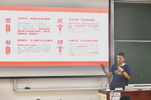 公司辅导员、本科党支部书记李娜向新生们详细介绍了入党条件和发展党员的程序流程,包括关于入党申请书的书写要求和党员的先锋模范作用的发挥等。她鼓励同学们坚定理想信念,敢于担当、勇于奉献,用实际行动向党组织靠拢。