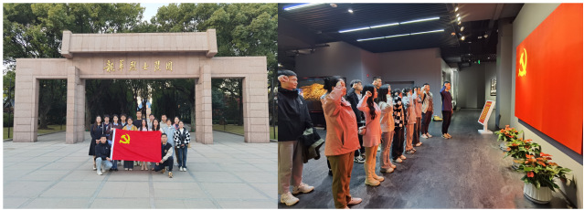 随后,党员们奔赴党日活动的第二站——龙华烈士陵园。从一号入口进入陵园,一座纪念碑矗立在陵园主轴线上,其正面镌刻着“丹心碧血为人民”7个大字。纪念碑后便是龙华烈士纪念馆,纪念馆内按照时间顺序布置,利用照片、遗物和影像等向观众展示了英雄们的不朽事迹。在馆内,支部书记带领大家面向党旗,重温入党誓词。