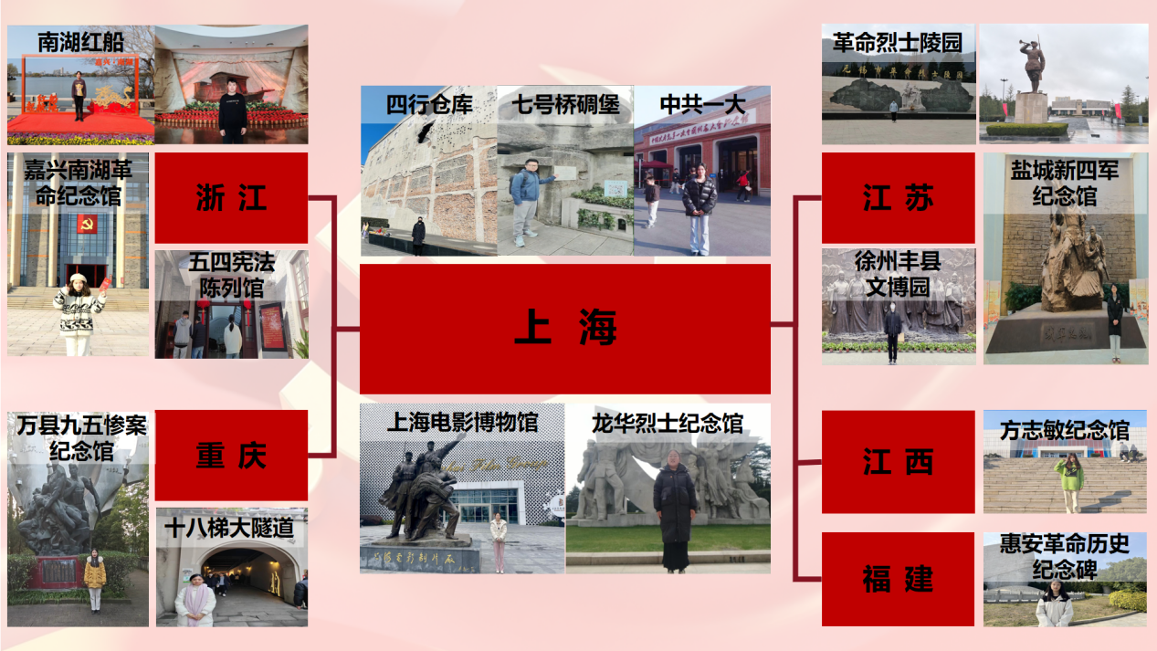 在探寻红色资源阶段,碳中和师生党支部党员以家乡的红色遗址、红色展馆为红色研学目标,通过参观纪念馆、观看纪录片、收听历史讲解等方式进行深入研学。活动共涉及到6个省份、14处红色资源,主要有中共一大纪念馆、上海四行仓库抗战纪念馆、上海七号桥碉堡遗址、上海龙华革命烈士纪念地、上海电影博物馆、浙江嘉兴南湖红船、浙江嘉兴南湖革命纪念馆、浙江杭州“五四”宪法历史资料陈列馆、江苏盐城新四军纪念馆、江苏徐州丰县文博园、江苏无锡革命烈士陵园、重庆万县九五惨案纪念馆、重庆十八梯大隧道遗址、江西方志敏纪念馆、福建惠安革命历史纪念馆。在讲述红色故事阶段,碳中和师生党支部在3月5日通过组织生活会的方式让党员们用视频、照片或者手册等形式分享家乡红色故事,并组织支部党员重温习近平总书记考察上海、浙江、江苏、江西、福建等地关于用好红色资源的重要讲话精神。