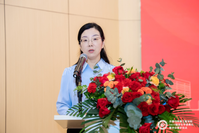 修光利书记为8位员工联络员代表颁发聘书。青年教师田程程作为教师代表发言,表达了对毕业生的祝福,希望毕业生们保持学习热情与动力,牢记责任与担当,学会感恩与回馈。博士毕业生傅梦茹作为毕业生代表发言,表达了对毕业生的祝福以及对老师家人的感谢,号召毕业们以梦为马,用青春智慧和汗水将论文写在祖国大地上,在强国建设、民族复兴的新征程上绽放新的光彩。