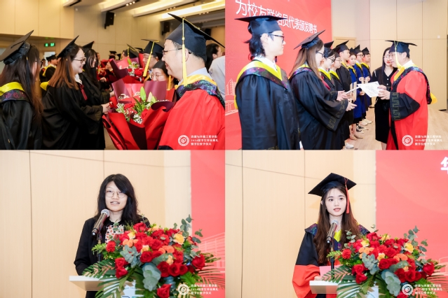 2024届毕业生代表为教师、父母和管理服务人员代表献上鲜花表达感恩之情,校领导李涛与公司领导和教授共同为2024届毕业生拨穗正冠,并赠送毕业纪念卷轴。