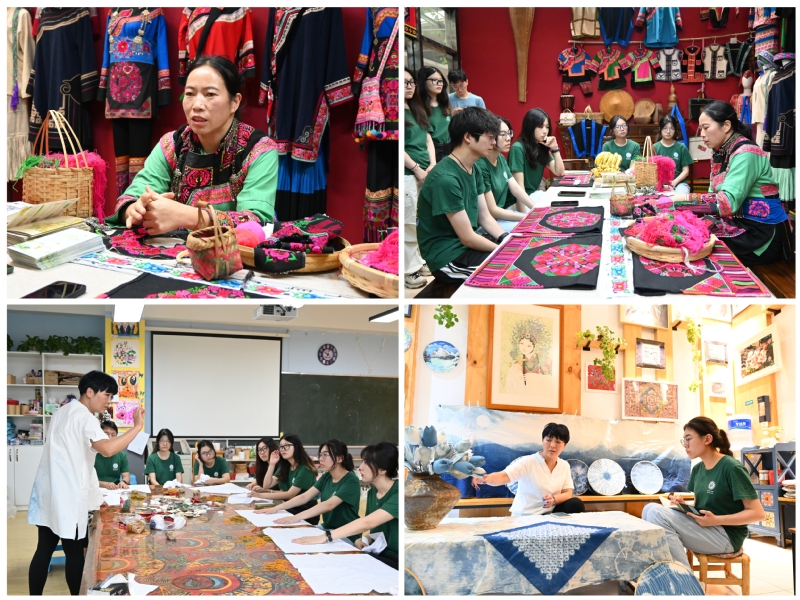 彝族刺绣是国家级非物质文化遗产,是彝族文化在漫长历史长河中传承的一种形式,具有深厚的文化底蕴和独特的艺术魅力。实践团成员赴寻甸阿梅梅彝绣文化传播中心,近距离对话彝族刺绣文化传承人——李文燕。随着李文燕的娓娓道来,那些繁复而美丽的刺绣纹样逐一揭开神秘面纱,她不仅介绍了每个图案背后的历史故事与象征意义,更分享了自己作为村主任,如何以这份热爱为动力,在重拾濒临失传的技艺之后,引领全村妇女及残障人士共同编织梦想,用针线绘制出一幅幅生动的乡村振兴画卷。实践团还拜访了仁德四小副董事长、美术教师老师鲁柱萍——一位将扎染艺术融入生活的匠人。在鲁柱萍老师的悉心指导下,实践团成员亲手体验了折、压、揉、夹、拆等多种扎染技法,感受着传统工艺的温度与魅力。