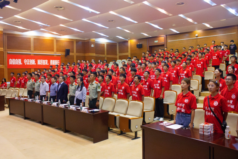 在奉贤新生本科典礼尾声,本科新生们在教官的带领下齐唱《强军战歌》,并通过精心制作的军训短片展示他们在军训期间的收获和风采,现场气氛热烈振奋。