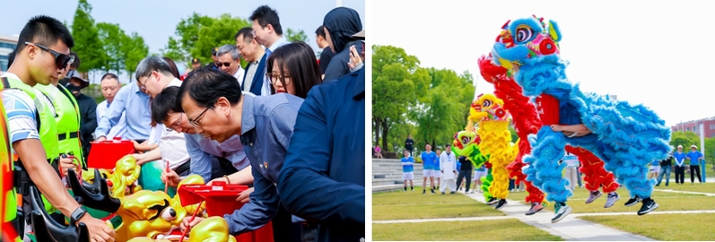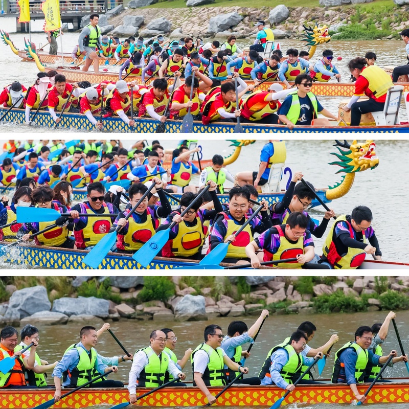 参赛队伍兴致勃勃地观看了员工舞狮队带来的精彩舞狮表演。各单位领导为龙舟点睛,为比赛赋予吉祥与活力。