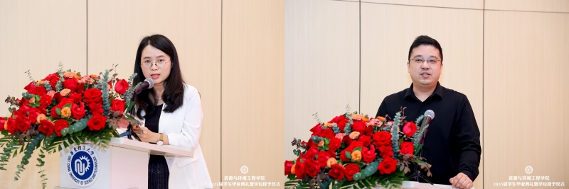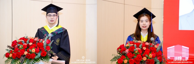 本科生毕业代表余佳禾和硕士毕业生代表郭佳仪发言,表达了对毕业生的祝福、对老师家人的感谢及公司的感恩,他们号召毕业们以习近平总书记对青年人的寄语为精神灯塔,以校训为帆,把课堂上和实验室里严谨治学的态度化作职场攻坚的底气,将课堂上学到的知识理念变成服务社会的实践,为推进中国式现代化贡献青春力量。