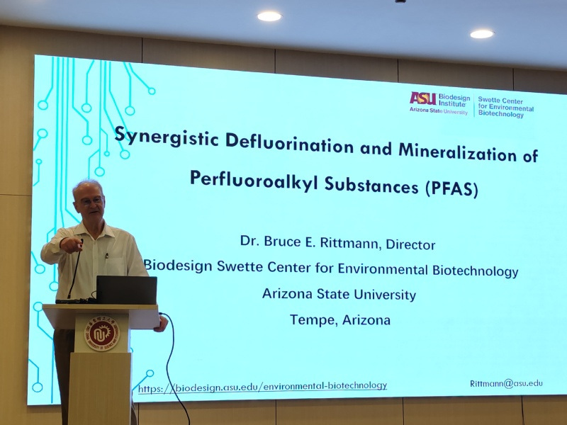 Based on his experience of studying for a doctoral degree and rich experience of education and teaching, Academician Bruce Rittmann shared his research course and achievements and told teachers and students how postgraduates and scientific researchers can be successful. He highlighted the crucial effect of maintaining curiosity and perseverance in the path of scientific research. It was just the longing for knowledge and the spirit of unremitting exploration that ed him to keep moving ahead in the research field of perfluoro and polyfluoroalkyl new pollutant joint defluorination and mineralization. At last, his team successfully realized the in-situ synthesis of the Pd0-based catalytic membrane, which provided a brand-new idea and approach for new perfluoroalkyl pollutants.